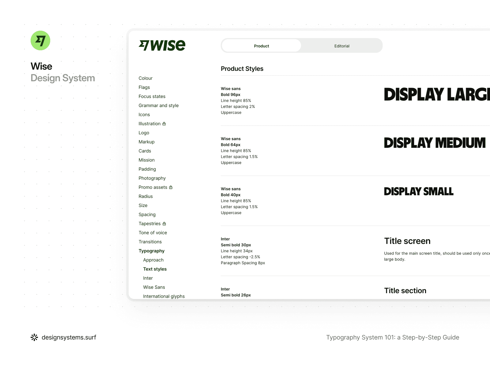 For example, in the Wise typography system, the structure is built around clearly defined Text Roles, within which controlled variations are permitted. The Display role exists as a single type of intent but is implemented through several sizes—Large, Medium, and Small—depending on the context and interface density.