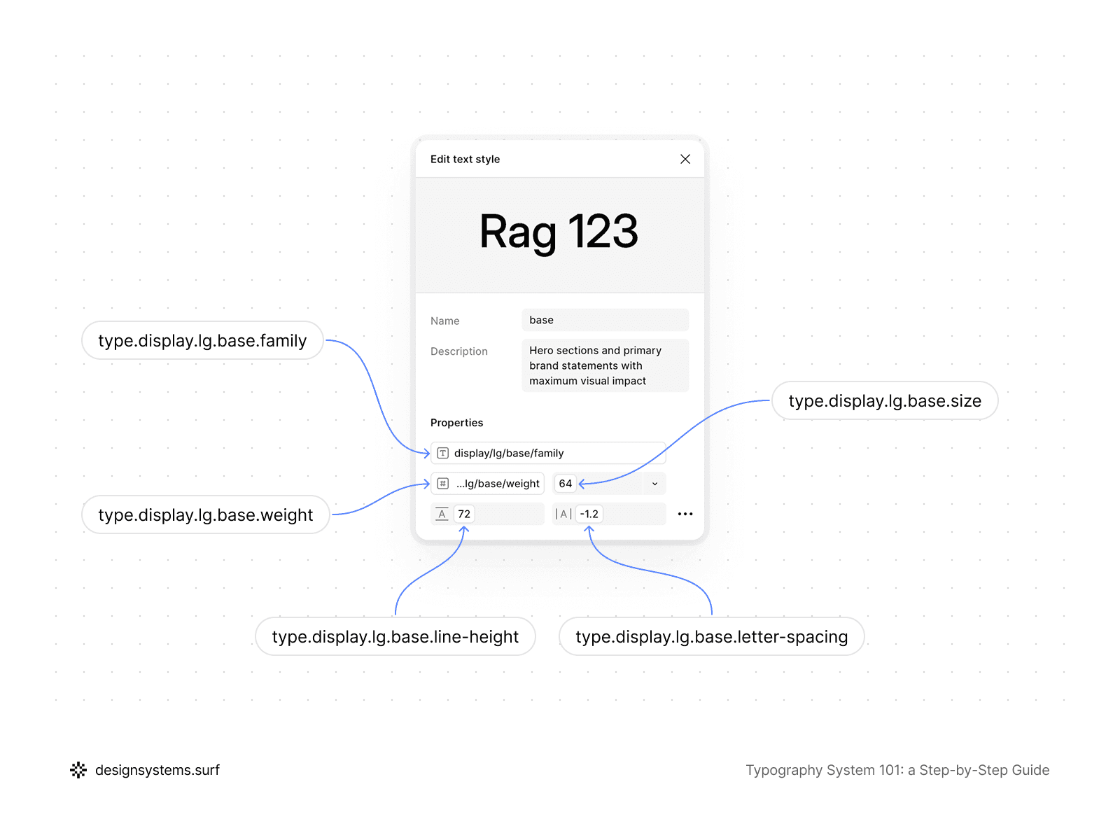 A style is described through a role-based structure such as display/lg/base, where display corresponds to the Text Role, lg to the size variation, and base to the specific behavior variant. Inside the properties, there isn't a single hardcoded value: font family, weight, size, line height, and letter spacing are linked exclusively via Semantic Tokens. A Text Style "knows" no numbers and does not reference Scales or Primitive Tokens directly—it works only with meaningful semantic values.