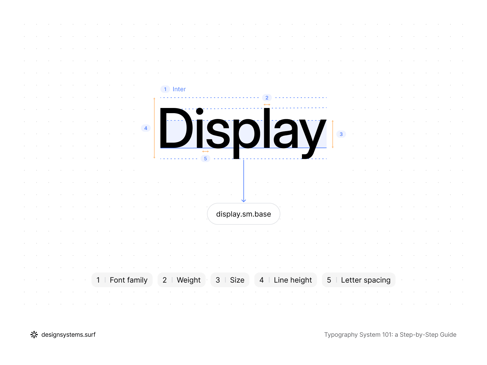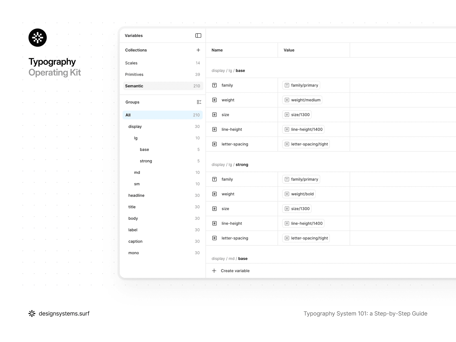 Primitive Tokens are built on top of the Scale to describe basic properties: font family, font weight, font size, line height, and letter spacing. When setting up typography variables in Figma, these tokens serve as neutral, reusable building blocks for the system. They do not know whether the text is a heading, body copy, or a label.