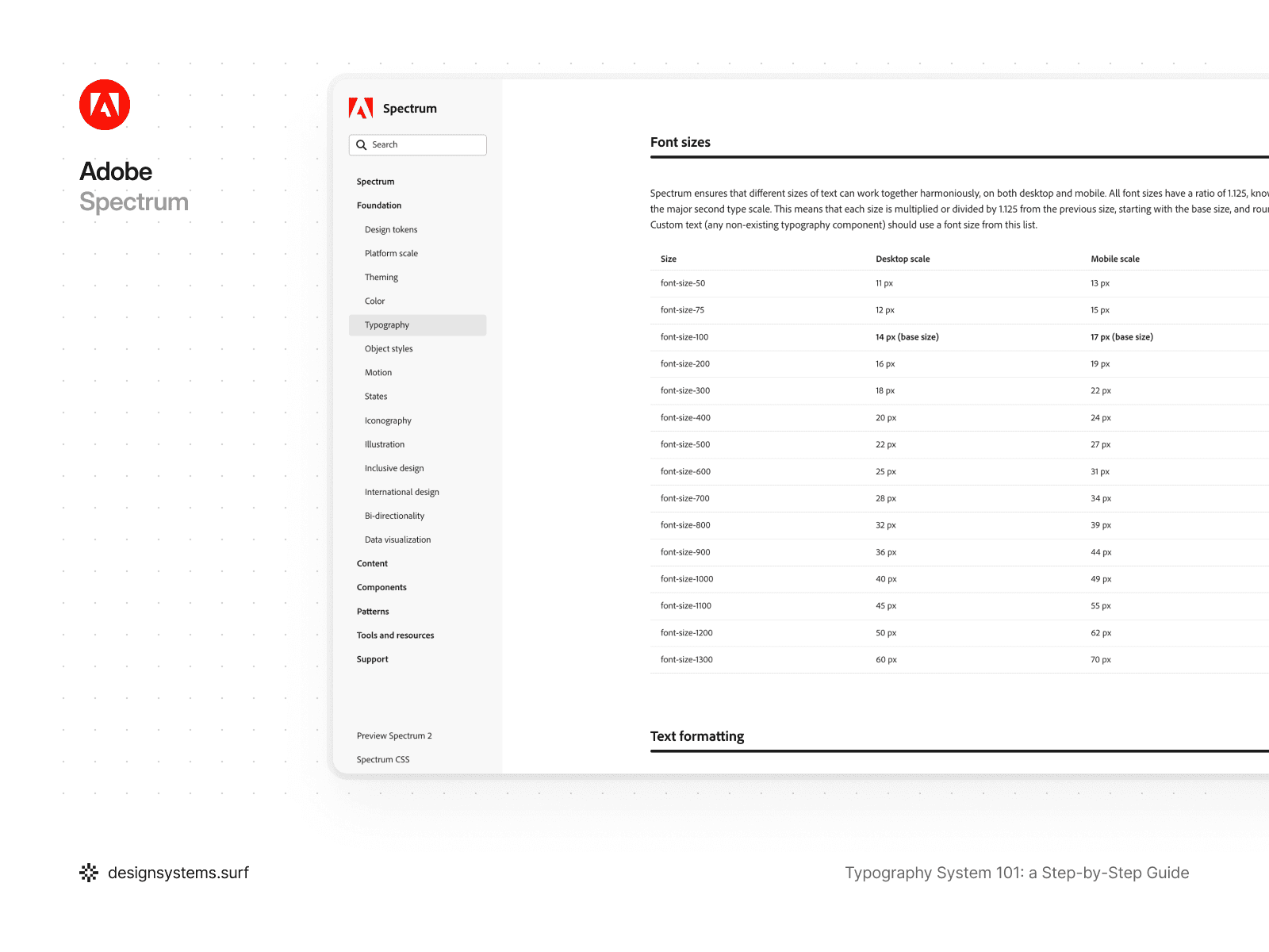 For example, Adobe Spectrum uses a Major Second type scale with a ratio of 1.125, which is applied to both desktop and mobile. All font sizes are calculated using a single formula starting from a base size and then rounded. In this case, the mobile version of the Scale is not a separate system—it is the same Scale, but with different values assigned to that mode. This approach ensures that hierarchy and rhythm are preserved regardless of the device.