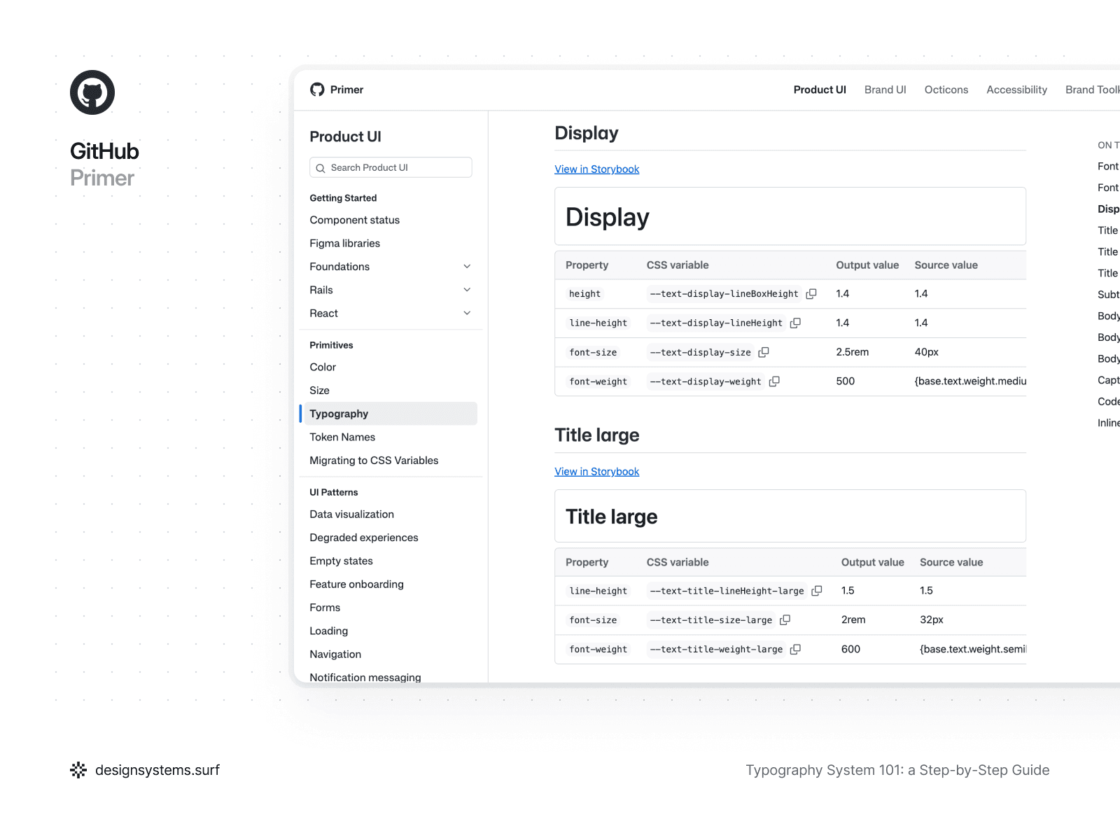 On the other hand, not all typographic properties must be rigidly tied to a numerical Scale. For instance, line height can be defined in relative units or percentages, as seen in GitHub Primer. This approach simplifies typography adaptation when font size changes, allowing readability to be maintained without the need to recalculate values for every step of the Scale. In this case, line height remains part of the system but is expressed through a relative rule rather than a fixed number.