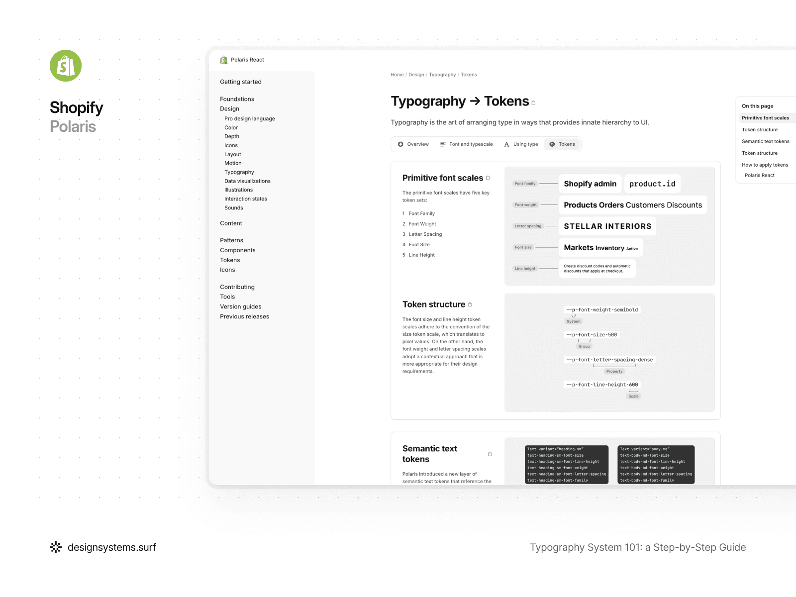 For example, in Shopify Polaris, typographic values are broken down into basic token scales for font family, font weight, font size, line height, and letter spacing. Font size and line height follow a numerical scale and translate into specific pixel values, while font weight and letter spacing are described through more contextual, yet still primitive, values. These tokens do not encode roles or usage scenarios and exist as a fundamental layer upon which semantic values and components are later built. This approach allows Polaris to change the scale, weights, or typography density without rewriting styles or breaking the system's structure.