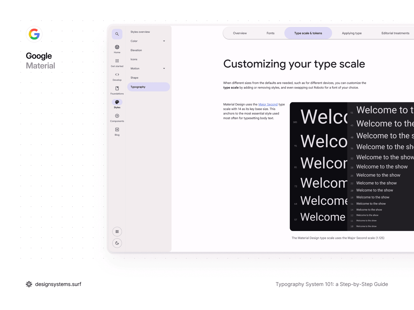 A different approach can also be chosen. Material Design uses a Major Second type scale with a base size of 14, which serves as the anchor for the most frequently used style—body text. This base size becomes the foundation for the whole hierarchy and keeps typography readable and stable across different screens.