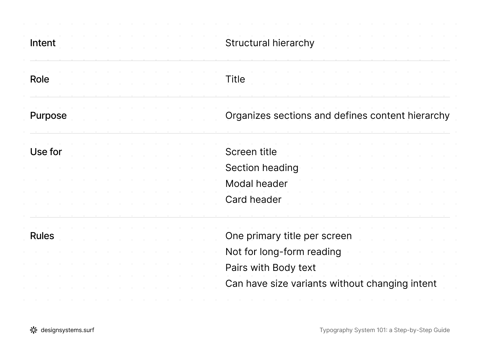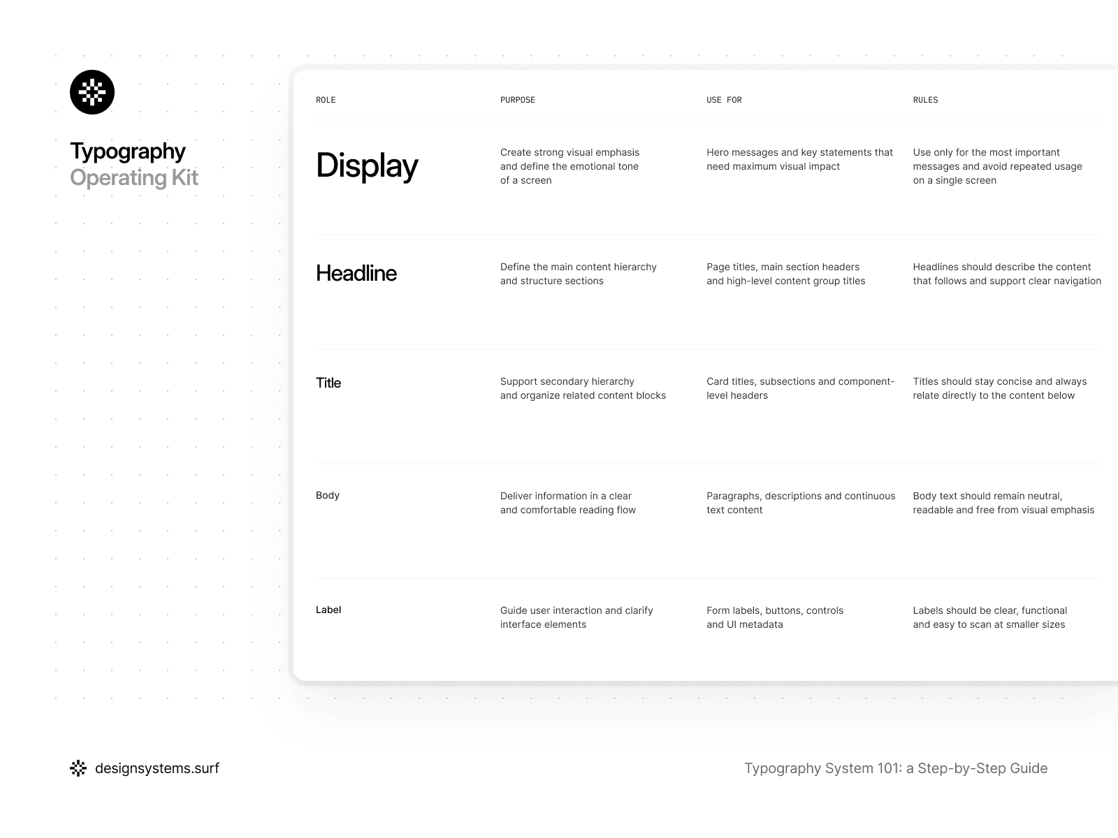 Up to this point, the typography system has been intentionally abstract. Scales established the proportions, and Primitive Tokens defined the permissible typographic properties, but the system still hasn't answered the fundamental question: what text exists in the product and why? Step 3 is the point where meaning emerges and the language the team uses to discuss typography is established.