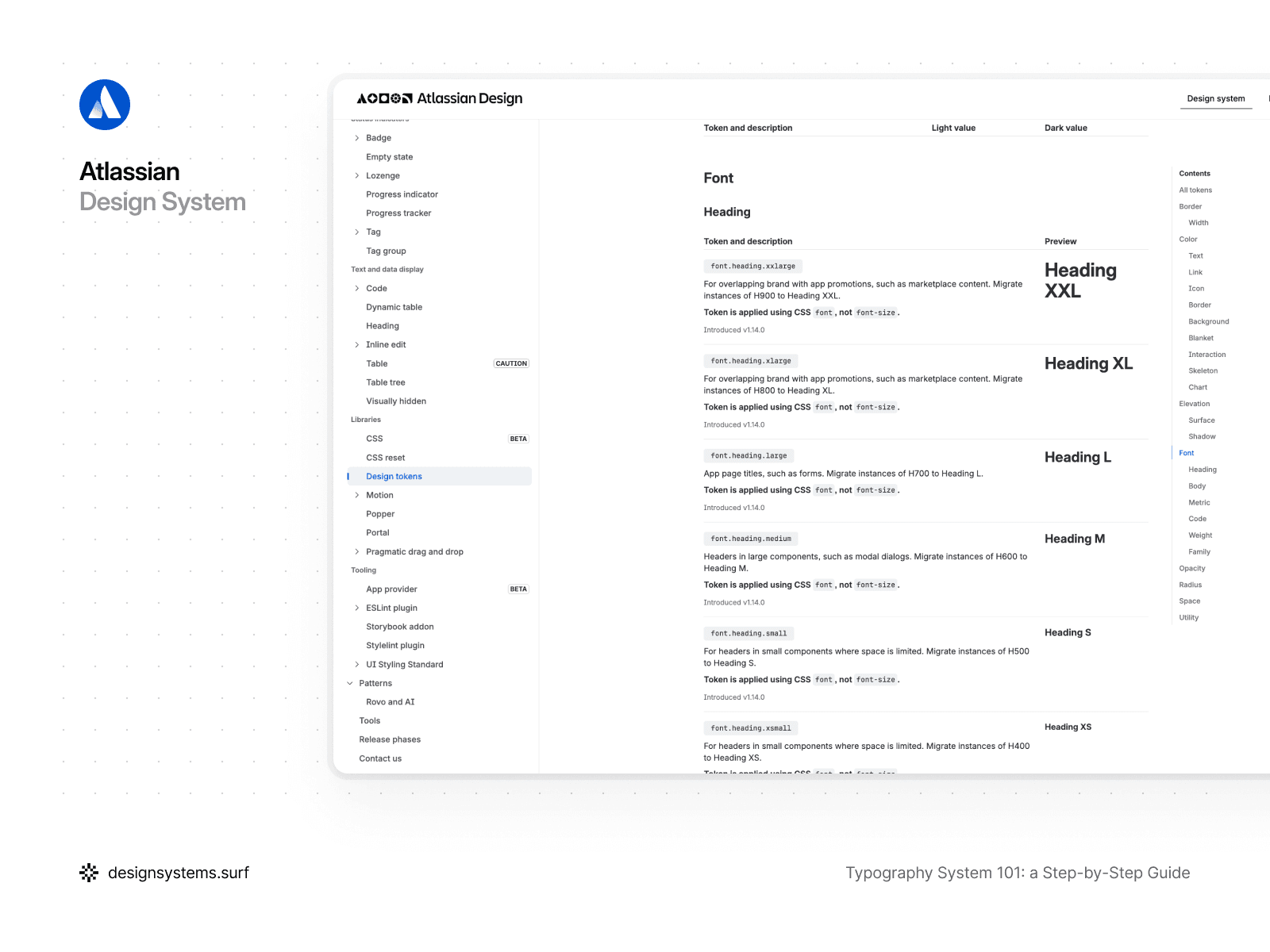 For example, in the Atlassian Design System, the semantic layer serves as the primary contract between intent and implementation. Instead of working with individual font-size or font-weight values, the system operates with semantic tokens such as font.family.heading, font.family.body, font.body, font.heading.large, or font.weight.medium. These tokens describe typographic intent rather than numerical values: which text is a heading, what is body copy, or where code and brand typography are applied. Semantic tokens can also point to different Primitive Tokens depending on context, and the meaning stays consistent.
