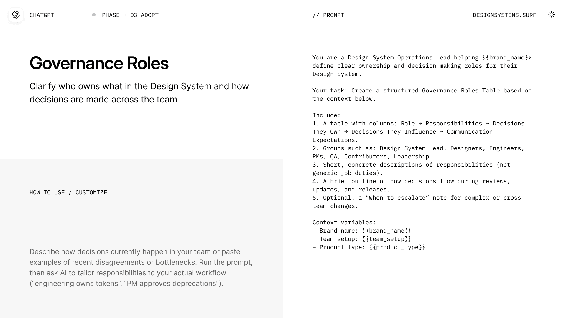 Use the Prompts Library to speed up decisions across foundations, tokens, components, docs, and governance