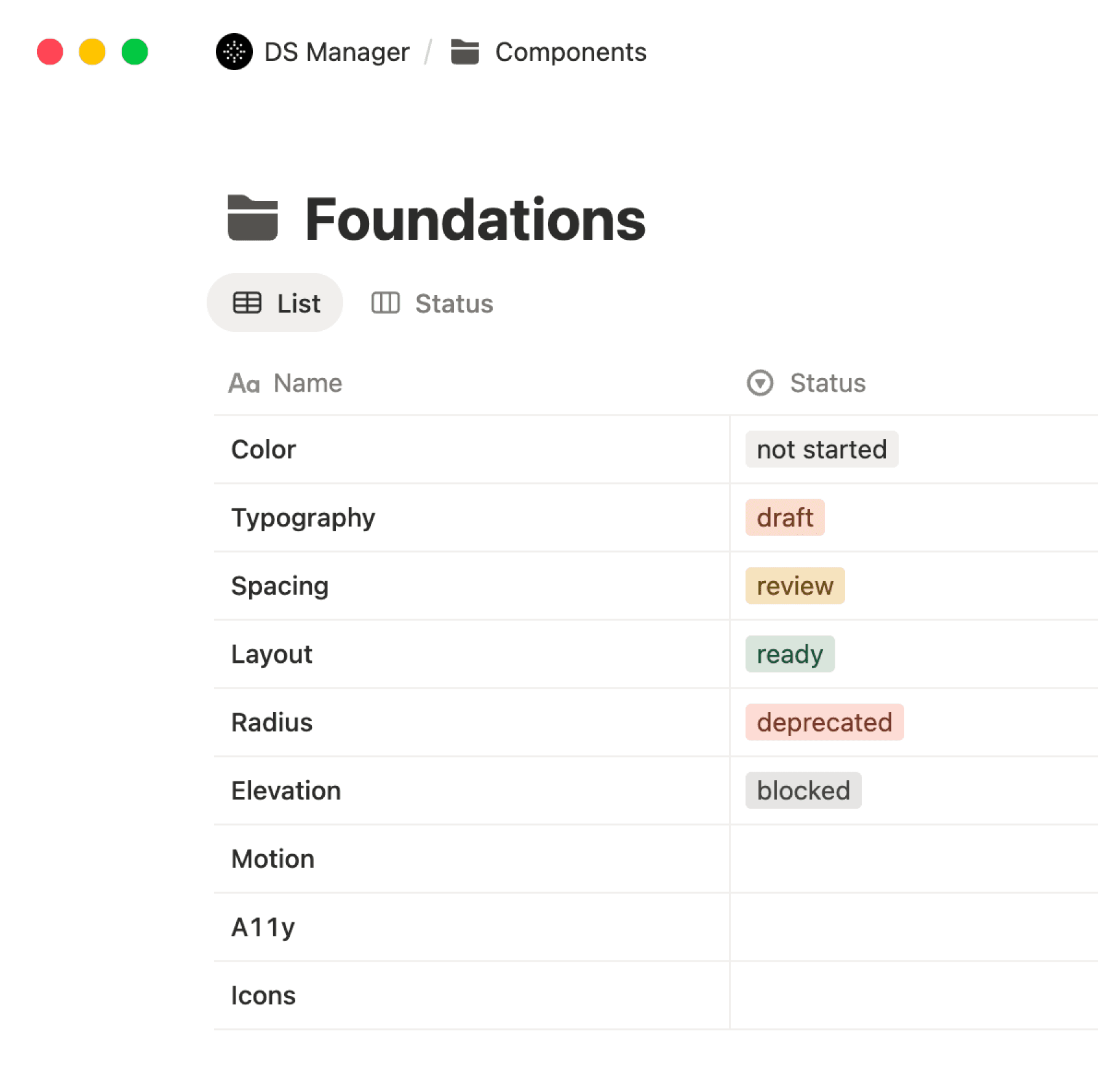 Use the Notion DS Manager to organize foundations, tokens, components, docs, and processes in one place